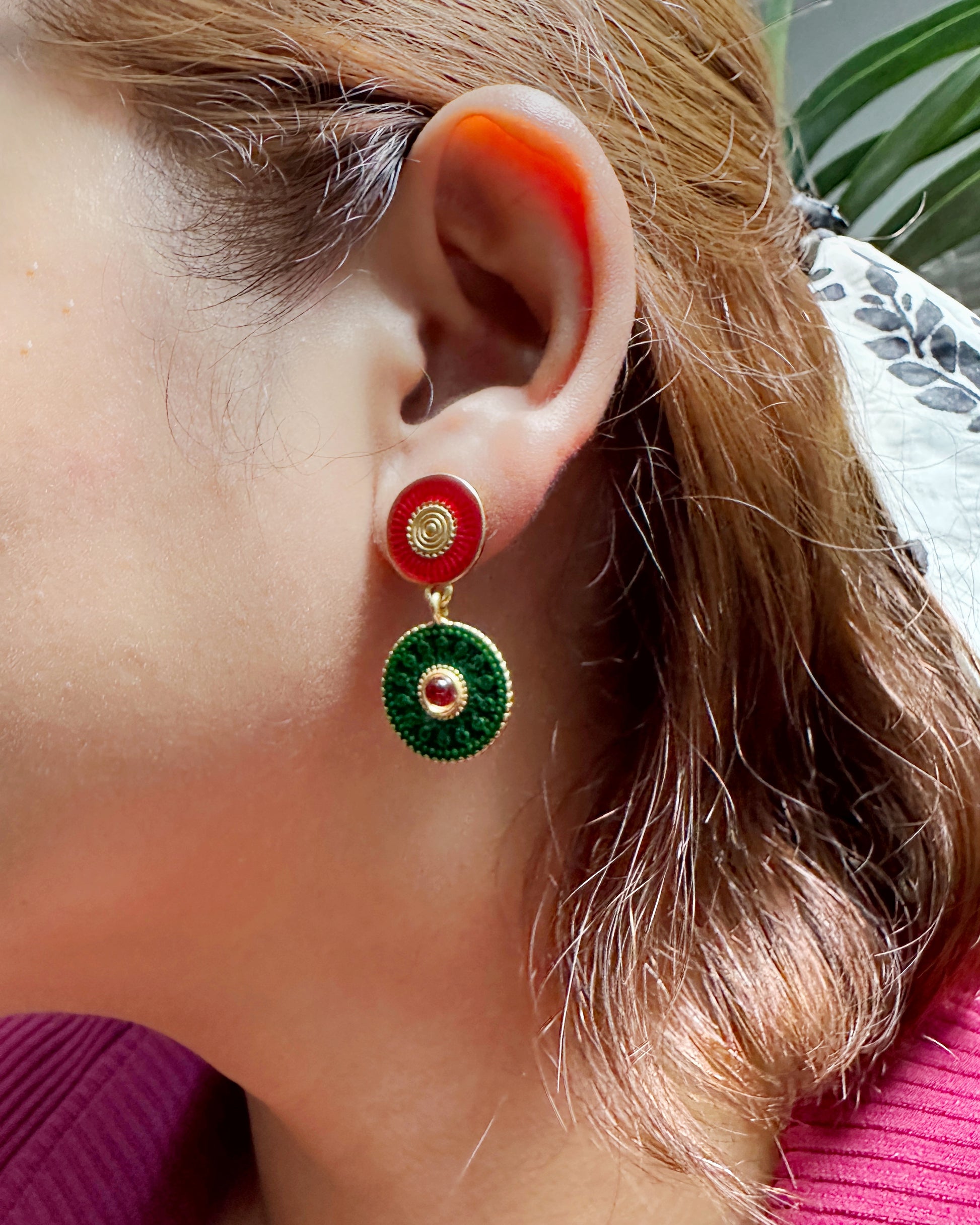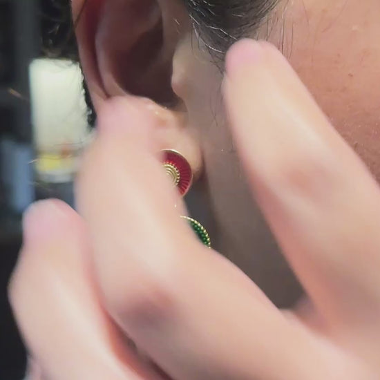 Embrace vintage elegance with these stunning statement earrings, crafted with vibrant green and red enamel details and accented by a bold gold-tone finish. Featuring intricate patterns and a central red gemstone for a pop of color, these earrings are perfect for making a statement at any occasion. Their secure post back ensures comfortable wear, while the bold color combination exudes a timeless charm.